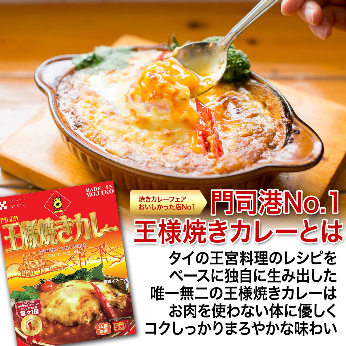 ・タイ王宮料理のレシピをベースに、ココナッツミルクと十数種類のハーブ、スパイスのフレッシュな香り漂う「王様カレー」を作り上げました。そしてほんのり焼き色のついたチーズが絶妙なバランスで仕上がる門司港名物「王様焼きカレー」として完成しました。
